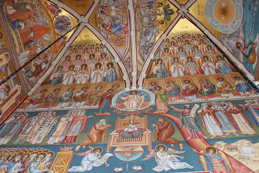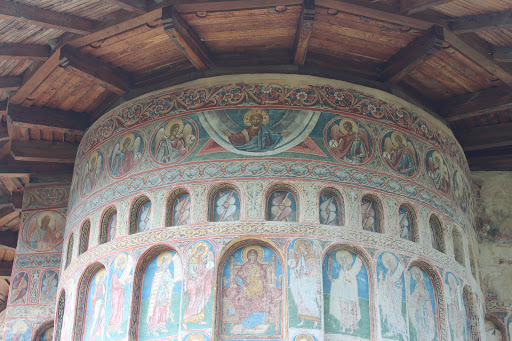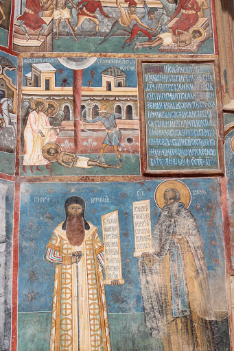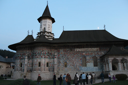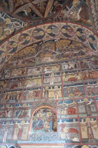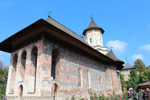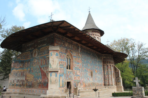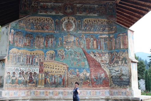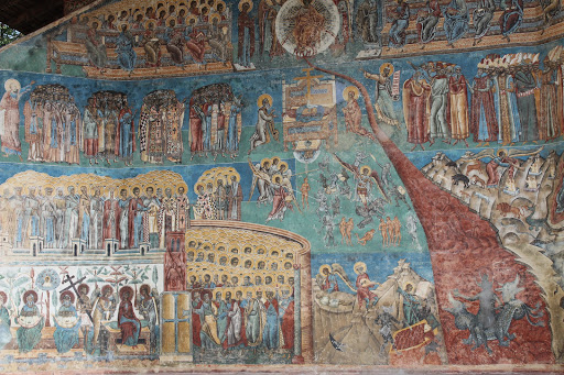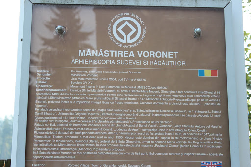Manastirea Voronet este socotita „Capela Sixtina a Orientului” pentru marea fresca de pe fatada de vest, numita „Judecata de apoi”. De asemenea „albastrul de Voronet” este considerat de specialisti ca unic in lume si cunoscut ca si rosul lui Rubens sau verdele lui Veronese. Pe fondul albastru este prezentat „Arborele lui Iesei” sau Genealogia lui Isus Hristos iar pe coloane sunt pictati filozofii greco-latini.