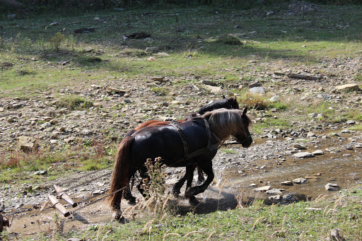 Cai de munte tragand busteni pe albia raului