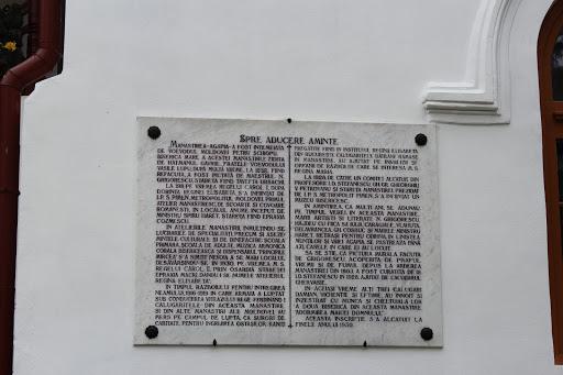 Ctitorirea manastirii ii este atribuita voievodului Petru I Musat, care a construit prima biserica din piatra, astazi disparuta. Pe amplasamentul manastirii, existase insa o bisericuta mai veche din lemn, numita Biserica Alba, construita de monahi cu un secol inainte. Biserica actuala din incinta manastirii a fost ctitorita de voievodul Stefan cel Mare la sfarsitul secolului al XV-lea si are hramul Inaltarea Domnului.