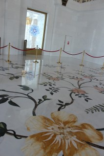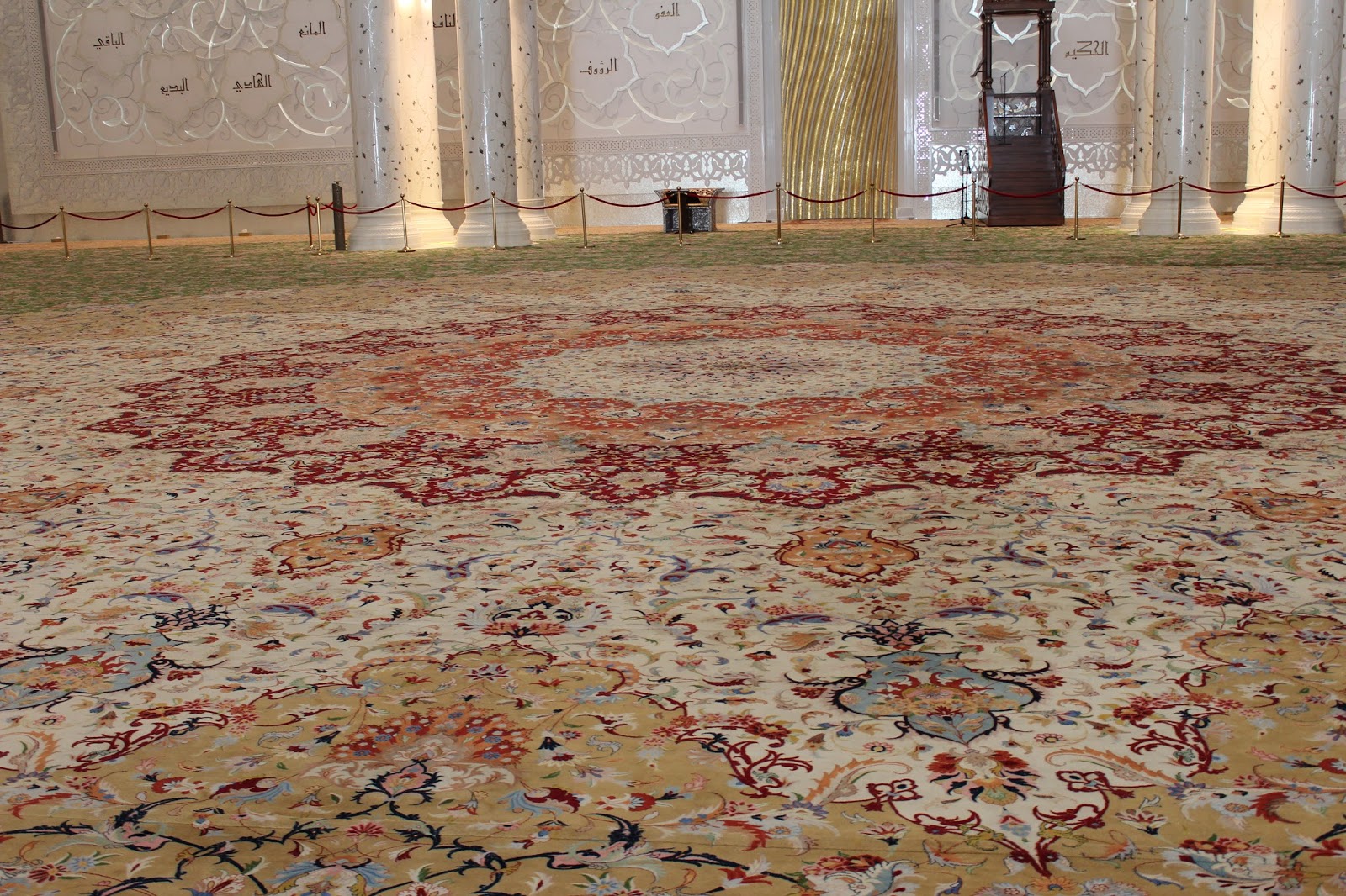 Si pentru ca ne aflam tot in zona cu „cea mai„, moscheea detine cel mai mare covor din lume realizat manual. Avand aproximativ 5700 mp a fost opera a aproximativ 1200 de artizani. Realizarea sa a durat circa 2 ani din care proiectarea a luat 8 luni, realizarea sa (innodarea) 12 luni iar restul timpului a fost transportul, taierea si coaserea bucatilor la un loc. Covorul a costat circa 6.000.000 de dolari.