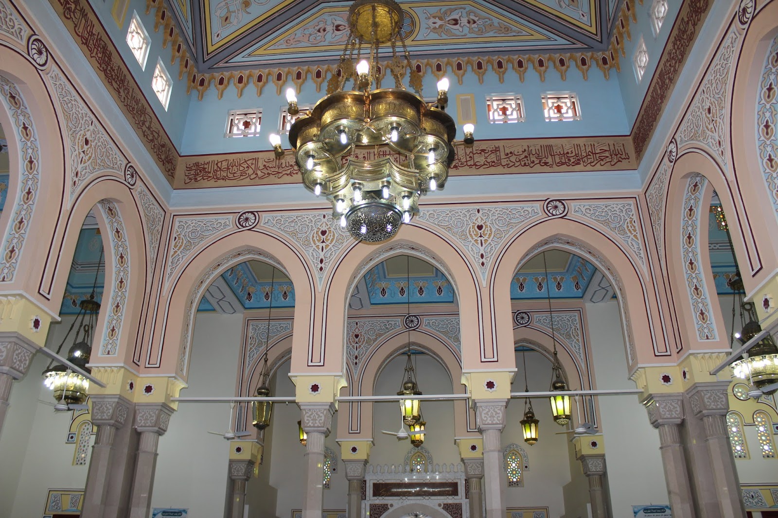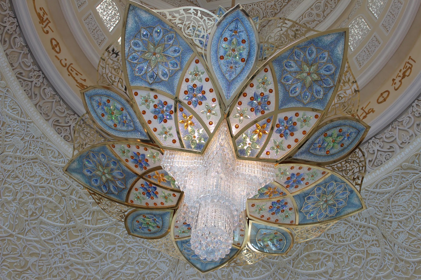 Patru candelabre albastre sunt amplasate in foaierul moscheei.
