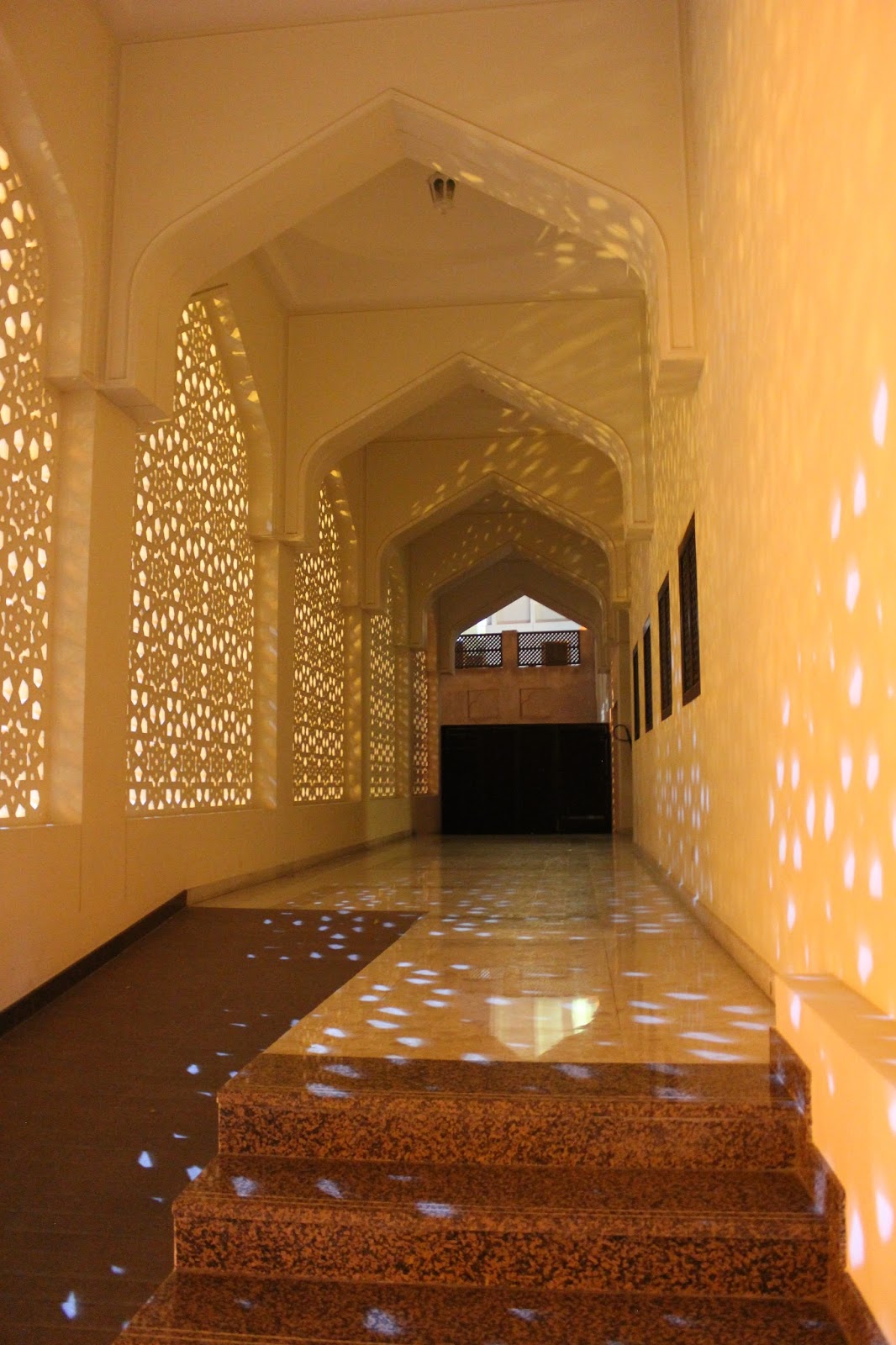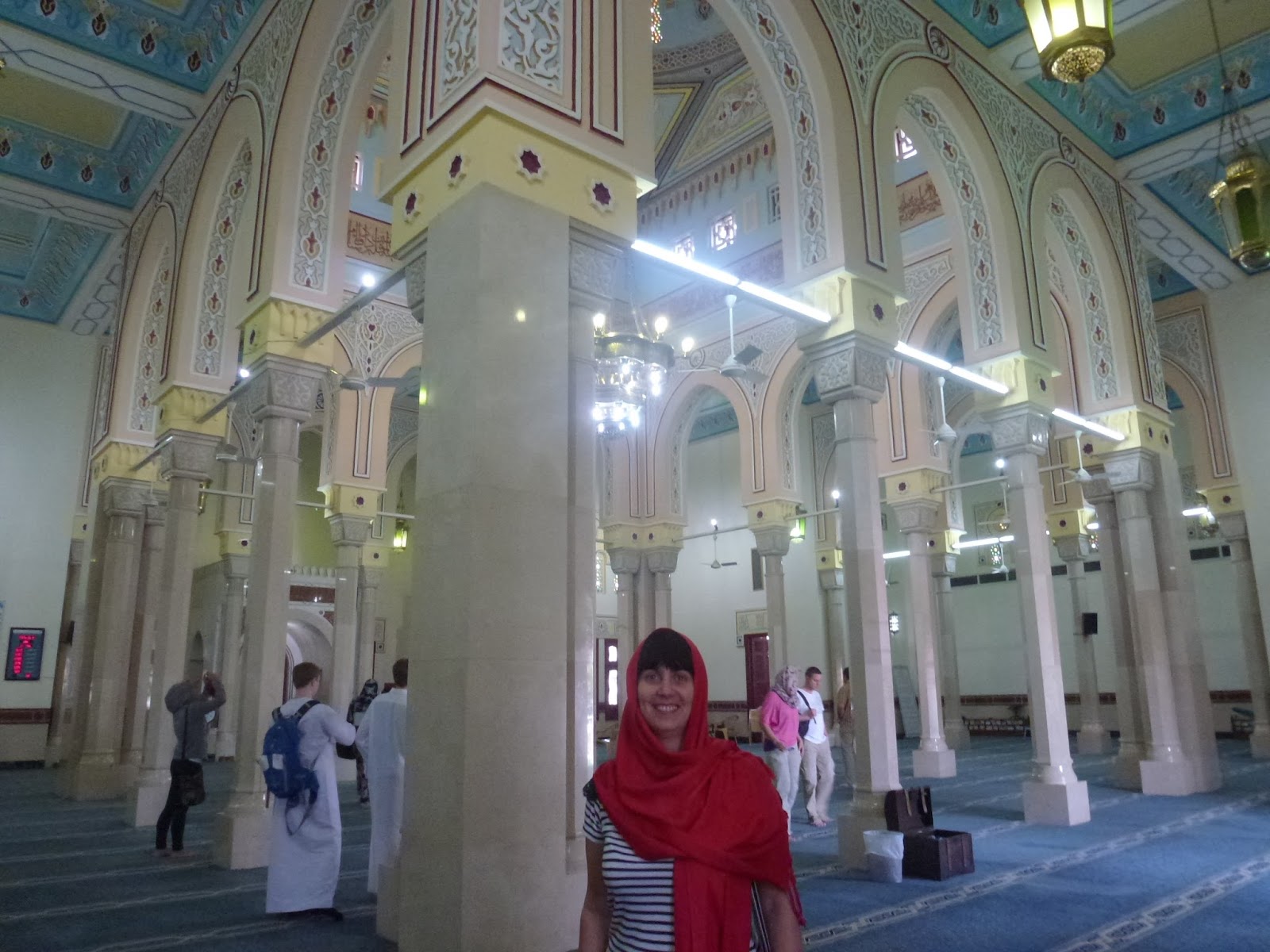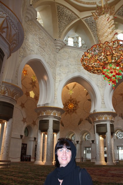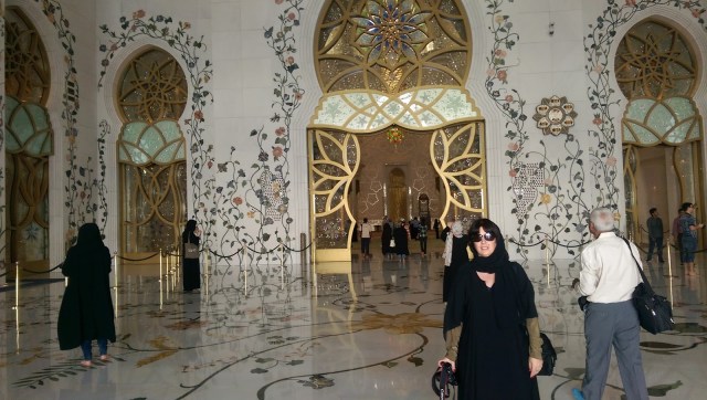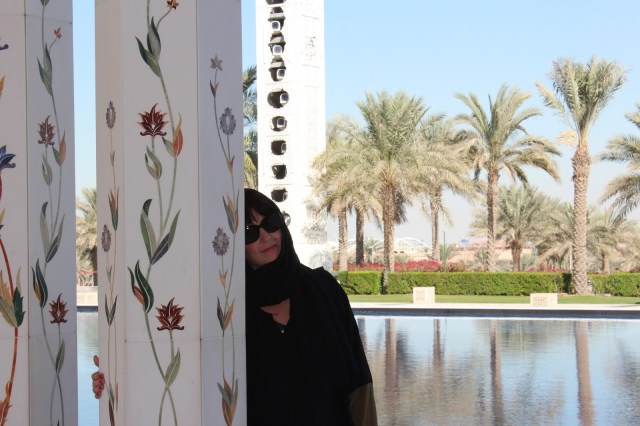 Dupa un drum de aproximativ 2 ore si jumatate ajungem intr-una din aerogarile din Abu Dhabi. Banuiesc ca cea principala. Ne interesam cum putem ajunge la Marea Moschee si luam unul dintre autobuzele indicate. Soferul, foarte dragut, ne spune unde trebuie sa coboram. Numai ca locul in care este statia de autobuz este destul de departe de intrarea in moschee. Si nu ar fi nimic daca afara nu ar fi ingrozitor de cald si un soare care parca te topeste. A fost cel mai groaznic moment din toata excursia. Am simtit ca ma scurg pe trotuar si nu pot merge mai departe. In final am ajuns. Si pentru ca tot eram lesinata si imi era cald de muream a trebuit sa-mi pun si portul traditional pe mine pentru a avea acces in moschee. Era un moment pe care il asteptasem, sa vad si eu cum este sa porti acest vesmant, dar faptul ca imi era atat de cald nu m-a lasat sa ma bucur la maxim nici de tinuta si nici de frumusetea extraordinara a moscheei.