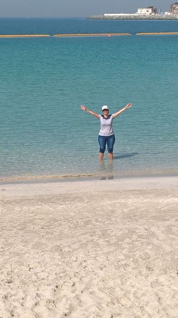 Si nu puteam pleca din Dubai fara sa vedem macar renumitele plaje si sa ne lasam mangaiati de apa avand o culoare extraordinara. Si pentru ca plaja publica aflata in apropierea moscheei Jumeirah este inchisa (in curs de reamenajare, fiind un mare santier) intram pentru cateva clipe pe plaja privata a unui hotel de 5 stele. Nu puteam sa nu ne bagam picioarele in …. Golful Persic …. Marea Arabiei …Oceanul Indian.