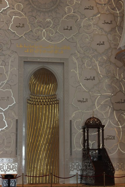 Mihrab-ul, nisa din perete care indica qibla, directia in care se roaga credinciosii, creeaza senzatia unei usi sau a unui culoar catre Mecca. Locul din care imamul se adreseaza credinciosilor, este realizat din lemn de cedru, incrustat cu sidef, mozaic de sticla si aur alb.