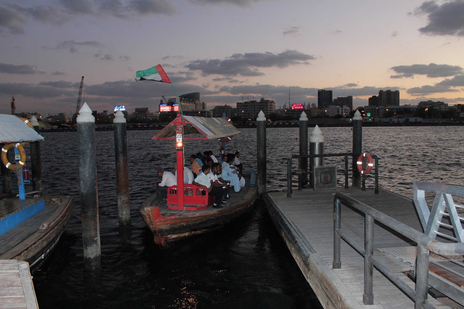 Cu ultimele forte ne ducem catre locul din care putem sa luam o abra. Ce poate fi mai frumos, mai romantic, decat sa traversezi canalul noaptea si sa vezi orasul, de o parte si de alta cu multele cladiri inalte scaldate in lumina….