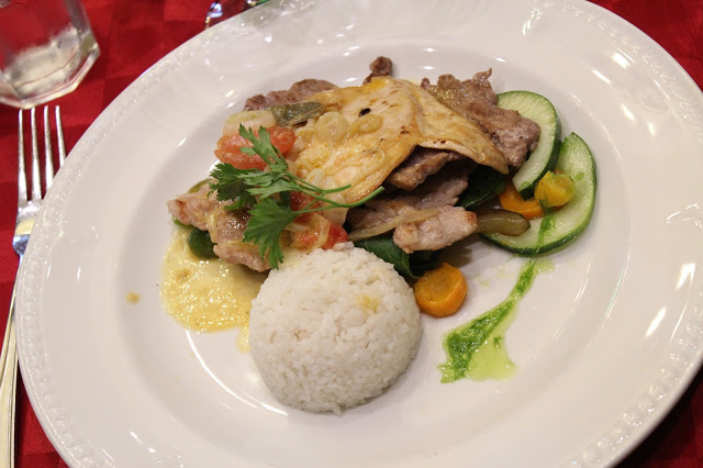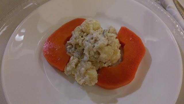Cina: aveam la alegere: creveti, peste sau pui. Fiecare a vrut altceva ca sa le testam pe toate. Am primit o salata foarte buna la inceput, un castron cu fasole neagra de care nu ne-am atins, niste creveti comestibili, am inteles (eu nu mananc asa ceva), un peste mancabil si un picior de pui/gaina fiert. Da, fier si atat. Cu salata de legume (diverse legume asezate pe o farfurie) si un platou de fructe. Si cam asta a fost disponibil in fiecare seara. Dimineata am mai primit marmelada, banane prajite, oua si niste mezeluri pe care nu stiu de ce le mai punea pe platou ca le lua asa cum le punea. Si asta sigur era mancare de lux.