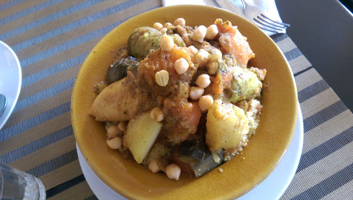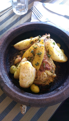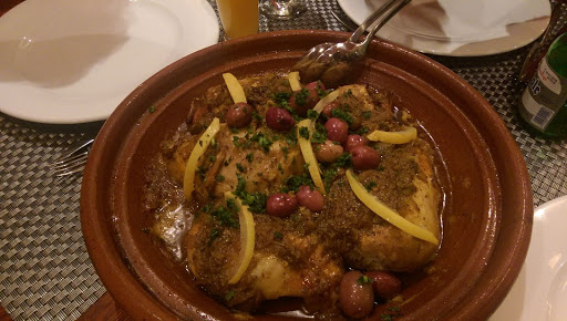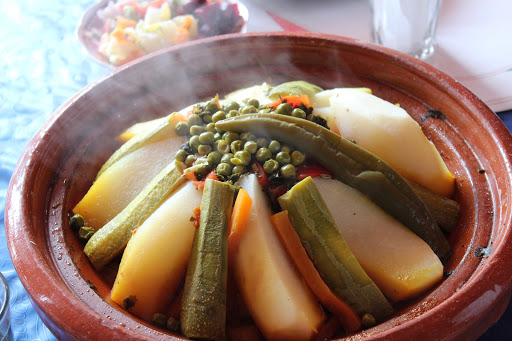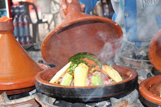 Si pentru ca a sosit ora pranzului … este timpul pentru un tajine. Tajine, al carui nume vine de fapt de la vasul in care este gatit, este mancarea traditionala in Maroc. Gatit intr-un vas de lut, cu capac conic, in general din pui sau vita, cu multe legume, condimente si nelipsitele masline, facut la foc mic, timp indelungat, tajinul nu trebuie ratat.