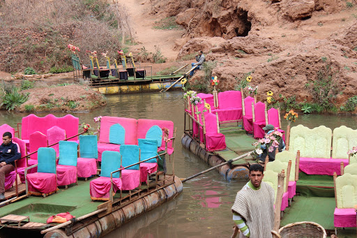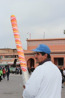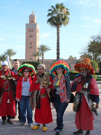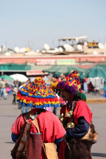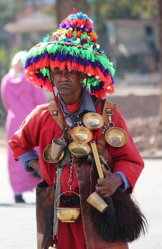 Pata de culoare pe care o intalnesti in toate locurile turistice din Maroc sunt vanzatorii de apa. Imbracati in costume rosii, cu palarii cu boruri largi, cu ciucuri viu colorati, cu pahare legate de costum si nelipsitul clopotel, te imbie la un pahar de apa sau mai bine zis, te invita sa faci o poza cu ei. Si normal, poza costa.