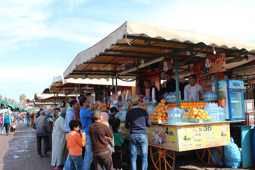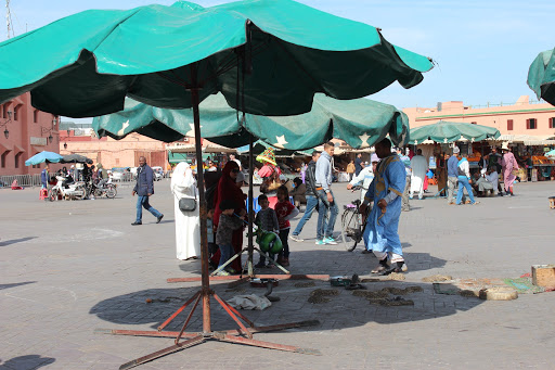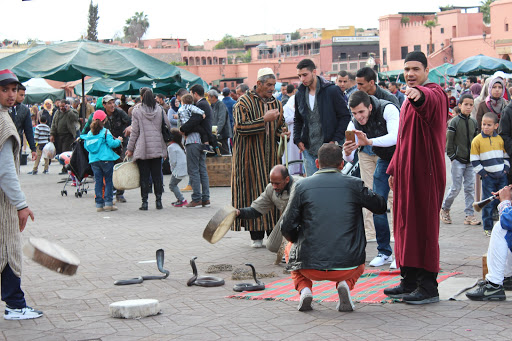 Piata Djemaa El Fna – probabil unul dintre cele mai vizitate locuri din Marrakech. O atmosfera unica creata de comercianti, dansatori, acrobati, imblanzitori de serpi, maimute si nelipsitele ghicitoare. Un loc care merita vizitat atat ziua dar mai ales seara.