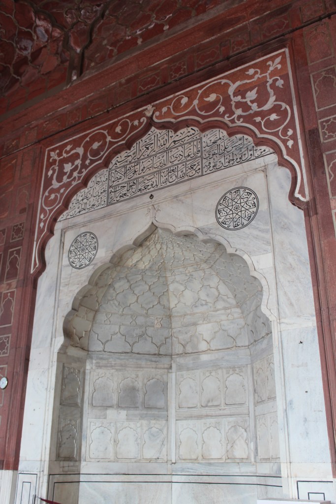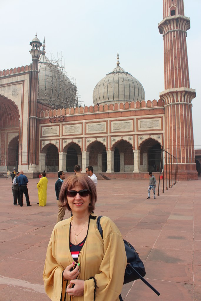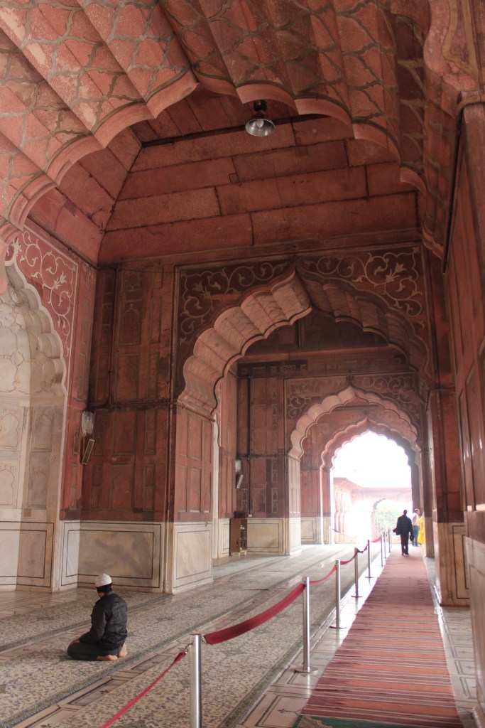 Prima oprire este la Jama Masjid, cea mai mare si cea mai cunoscuta moschee din India, situata in apropiere de Red Fort. Constructia moscheei a fost inceputa in 1650 si a durat 6 ani. Ea a fost realizata de catre Shah Jahan, ca de altfel si Red Fort, din marmura alba si piatra rosiatica. Se remarca prin maretia si grandoarea acesteia. Ca in orice loc sfant din India, ca sa intri, trebuie sa te descalti. Pe durata intregii vizite in interiorul moscheei, chiar si in curtea acesteia, esti descult si femeile primesc o haina specifica pentru a se acoperi.
