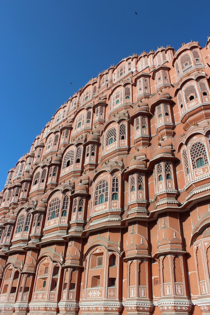 Construit in anul 1799 de catre maharajahul Sawai Pratap Singh, Palatul Vanturilor, are forma coroanei lui Krishna, zeul hindu. Acest palat este de fapt mai mult un perete, o fatada ce face legatura cu Palatul. El a fost realizat pentru a le permite doamnelor de la curtea regala sa priveasca strada fara a fi zarite. Palatul are cinci etaje, 953 de ferestre micute, fiind construit din gresie rosie si roz. Numele de Palat al Vanturilor vine de la sistemul de ventilare naturala care permite circulatia aerului in interior si crearea unei brize sau un aer conditionat al acelor vremuri. Am intalnit si in Iran ceva asemanator.